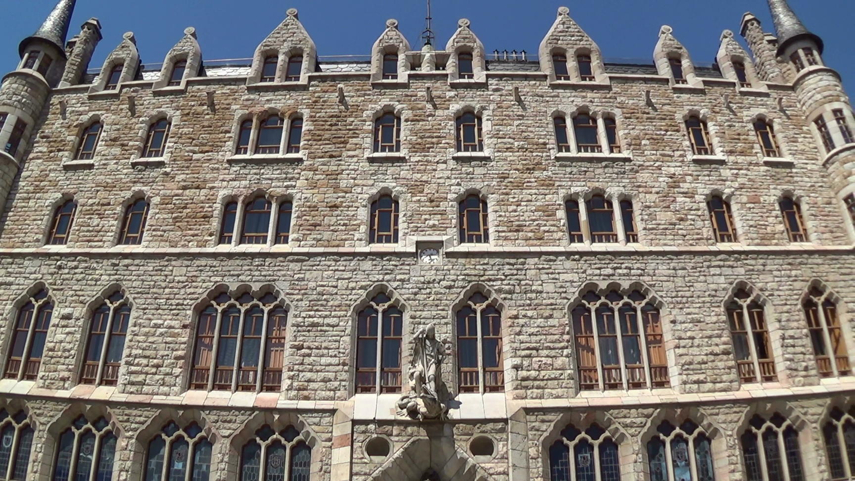 Casa de los Botines on Plaza San Marcelo. Architect Antoni Gaudi, built in 1892. Leon is a city on the Camino de Santiago (St. James Pilgrims Trail), which is UNESCO World Cultural Heritage Site. This is a panorama from the left to the right.