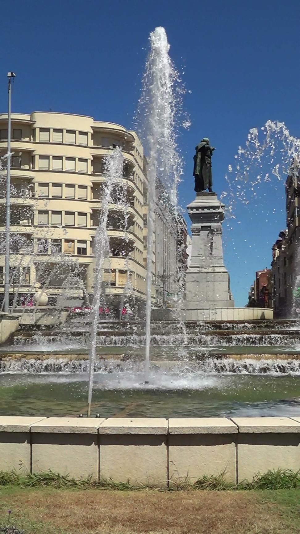 Fountain and statue in the center of Plaza de Guzman el Bueno. Leon is a city on the Camino de Santiago (St. James Pilgrims Trail), which is UNESCO World Cultural Heritage Site.