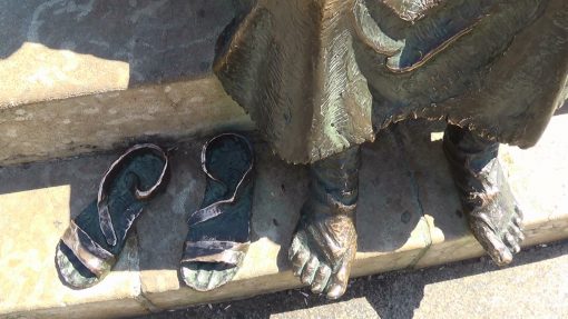 The medieval pilgrim on Plaza de San Marcos, right in front of the Parador de Leon. This is a panorama down the sculpture. Leon is a city on the Camino de Santiago (St. James Pilgrims Trail), which is UNESCO World Cultural Heritage Site.
