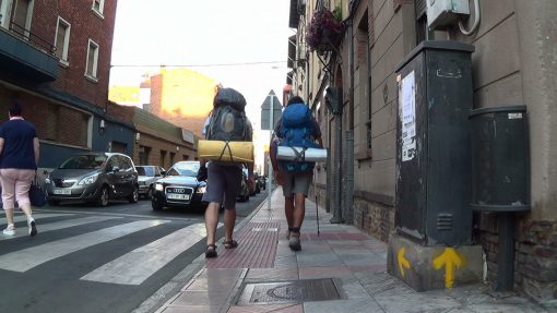 Pilgrims on Calle Renueva, leaving the old town. Leon is a city on the Camino de Santiago (St. James Pilgrims Trail), which is UNESCO World Cultural Heritage Site.