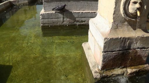 Fountain and pool on Plaza del Grano, right at the pilgrims albergue Las Carbajalas and the restaurant El Grifo.