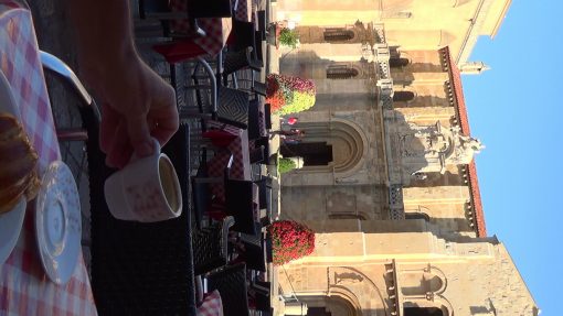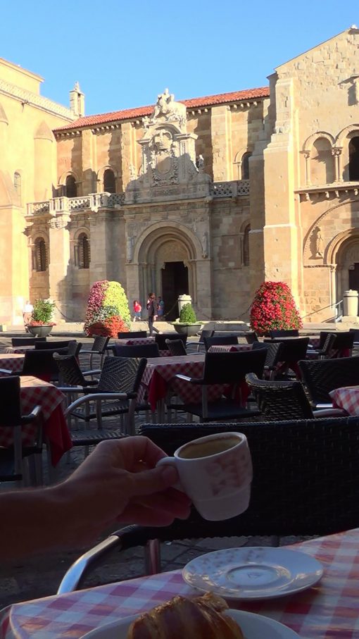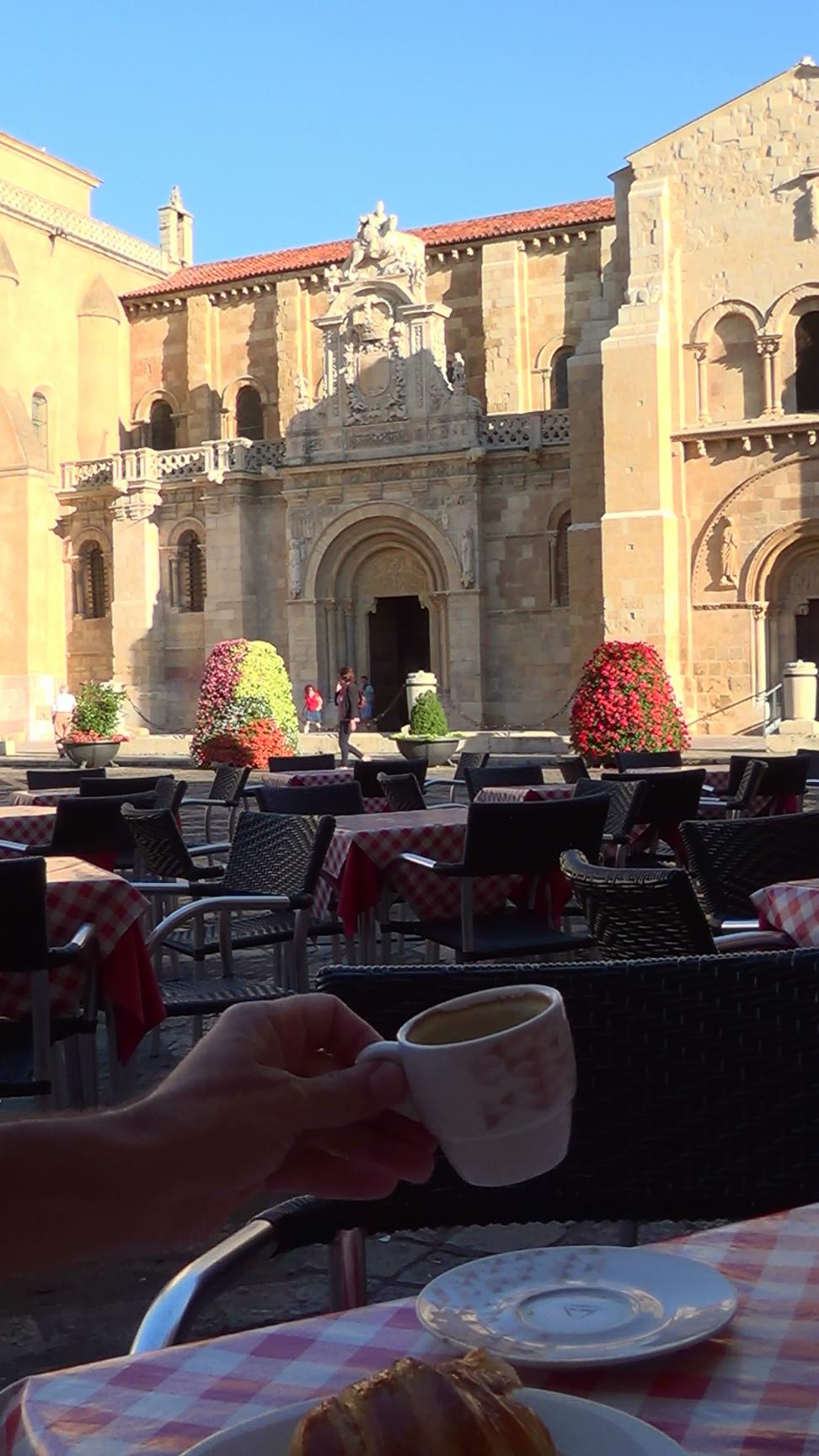 The Real Basilica San Isidoro on Plaza San Isidoro, seen over the morning coffee. Leon is a city on the Camino de Santiago (St. James Pilgrims Trail), which is UNESCO World Cultural Heritage Site.