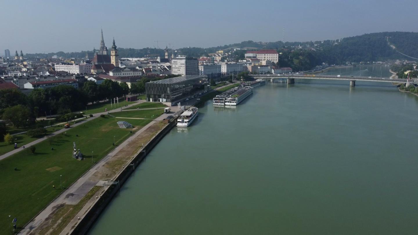 Old town, Nibelungenbrücke and the Lentos museum, seen from the Danube River. This is a flight backward.