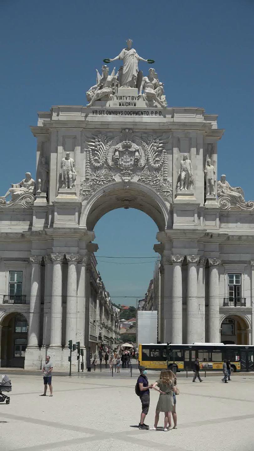 葡萄牙里斯本。特茹河边的大广场 Praca do Comercio 上的 Arco da Rua Augusta。这是从右到左的全景。