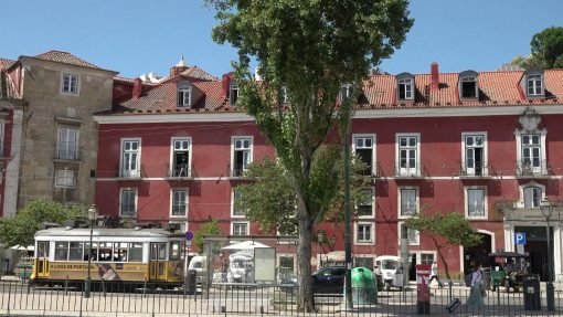 The old, rickety Carris tramway line number 28 on Largo Portas do Sol. This is a panorama from the left to the right.