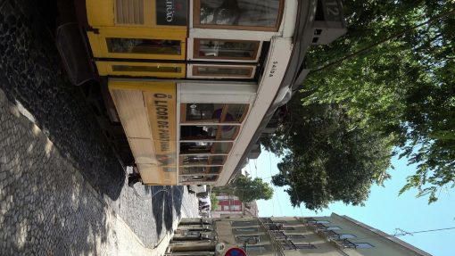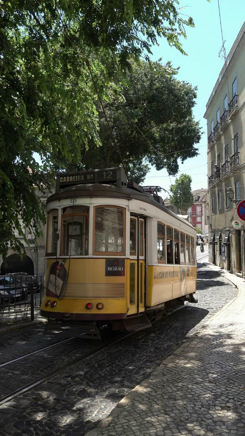 The old, rickety Carris tramway line number 28 on Rua Sao Tome. Upright size.