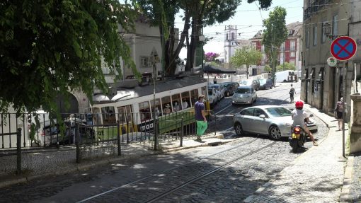 The old, rickety Carris tramway line number 28 on Rua Sao Tome.