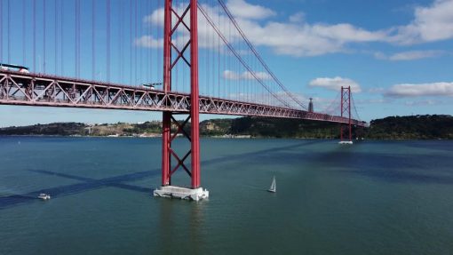 The Ponte 25 de Abril, seen from Belem. Cristo Rei in the distance. Drone Flight.