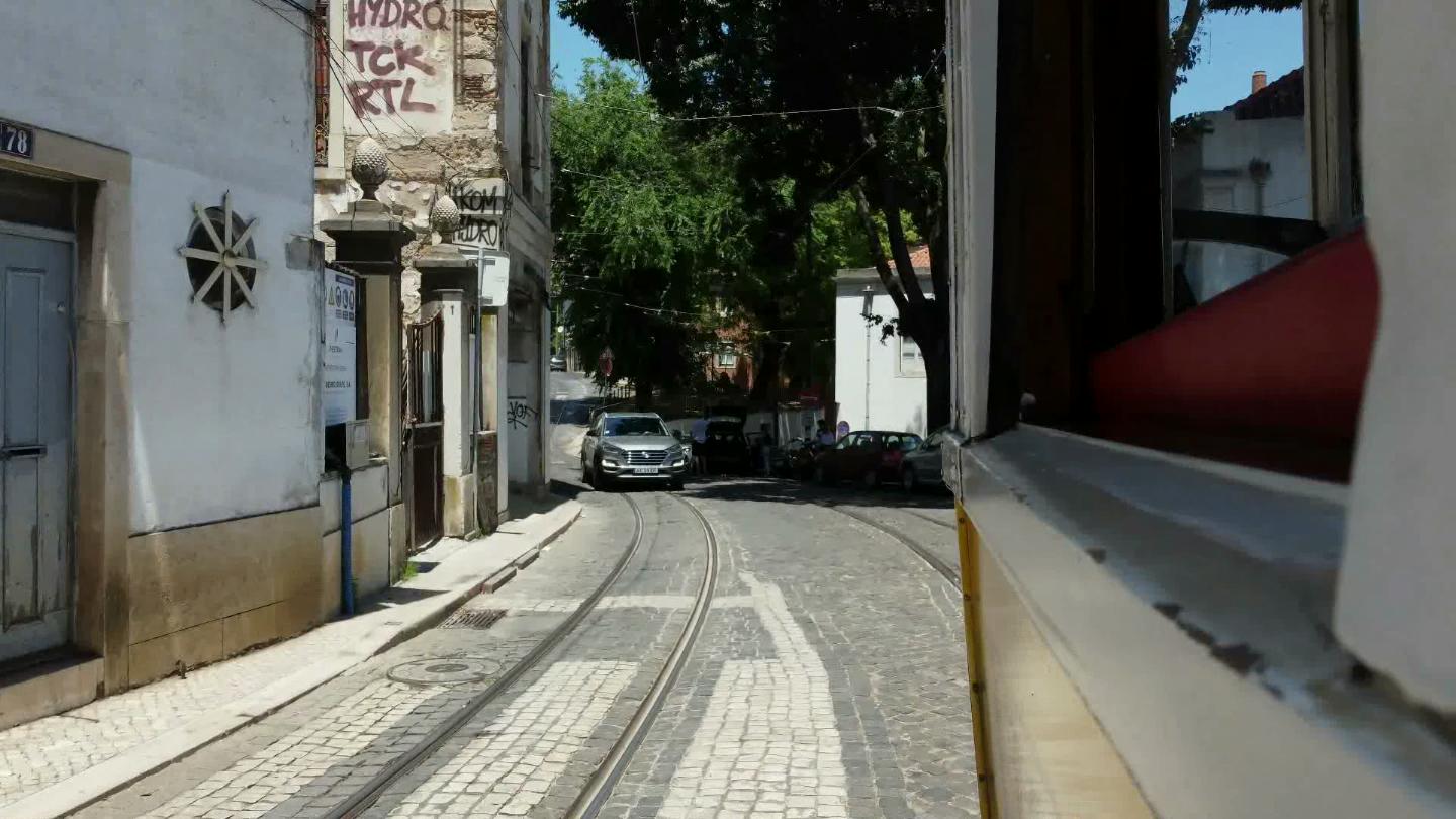 On the old, rickety Carris tramway line number 28 through Alfama. The streetcar approaches Portas do Sol.