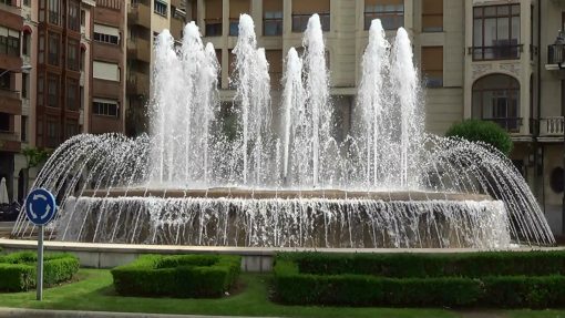 Plaza del Alferez Provisional, the fountain within the roundabout, at the western end of the pedestrian zone. This view is closer to the central fountain than the video clip no. 73034-2