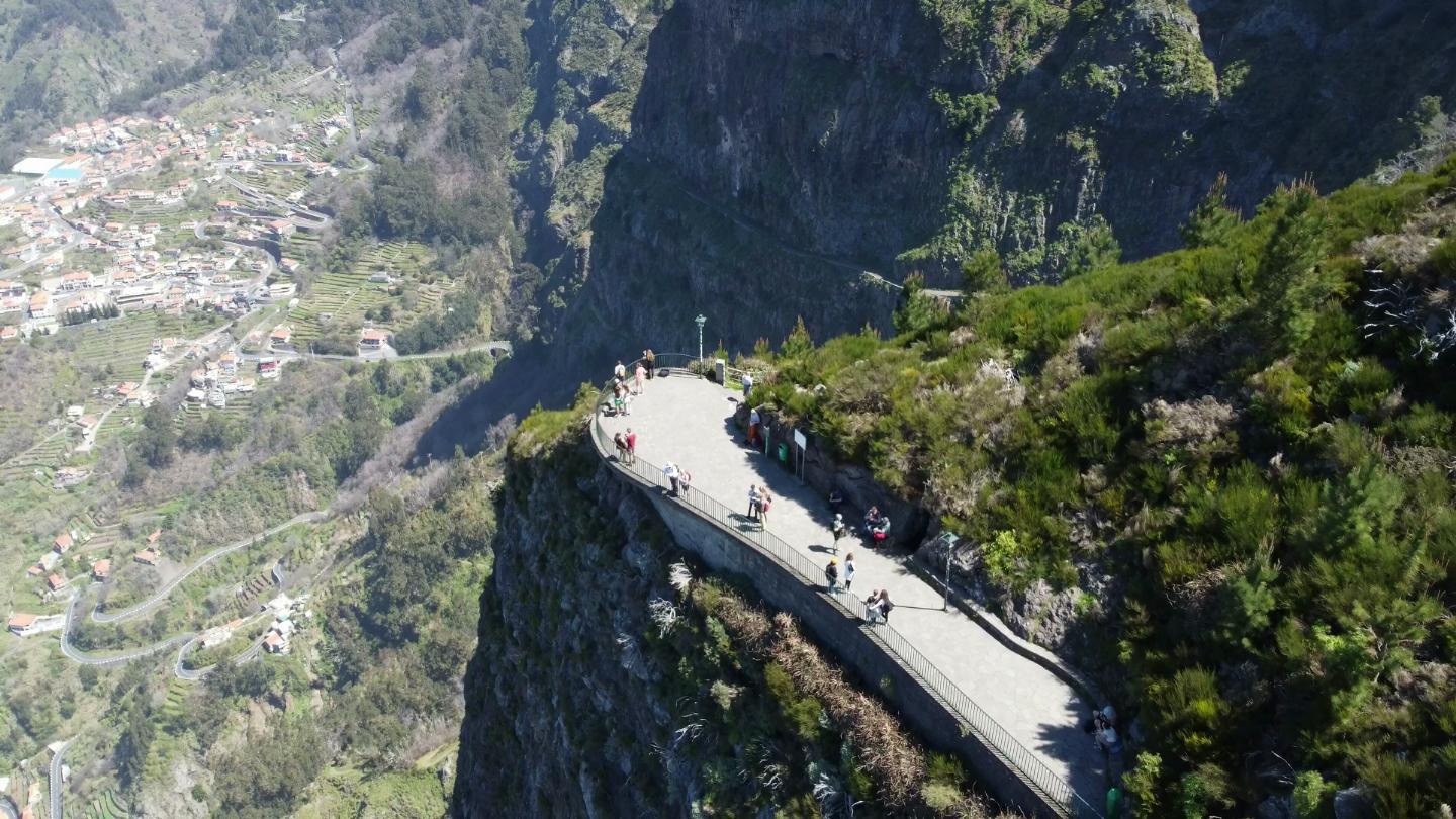 The village Curral das Freiras in the mountains of Madeira, seen from Eira do Serrado. Panorama to the right, then a drone flight backward, over the Miradouro (viewpoint).