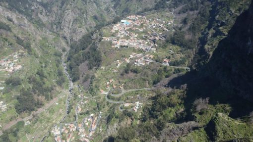 The village Curral das Freiras in the mountains of Madeira, seen from Eira do Serrado. Drone flight forward over the Miradouro, then a panorama to the left.