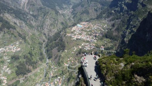 The village Curral das Freiras in the mountains of Madeira, seen from Eira do Serrado. Tilt down and drone flight backward.