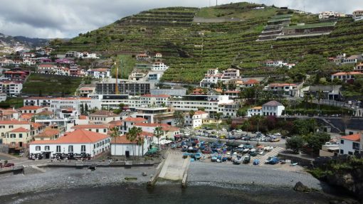 In the bay of the fishermen village Camara de Lobos, west of the city of Funchal. Drone flight forward.