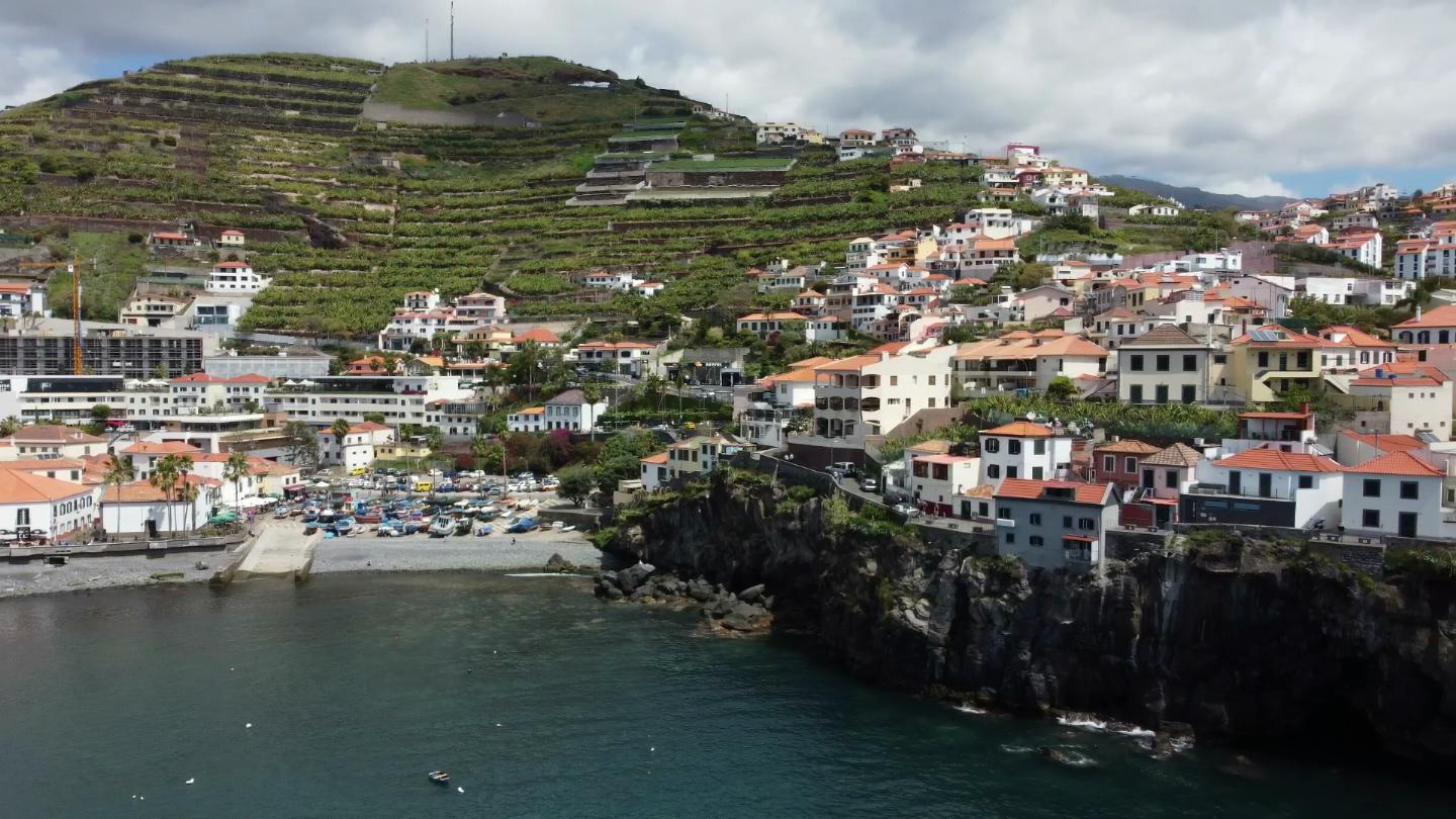 In the bay of the fishermen village Camara de Lobos, west of the city of Funchal. This is a panorama from the left to the right. Drone flight.