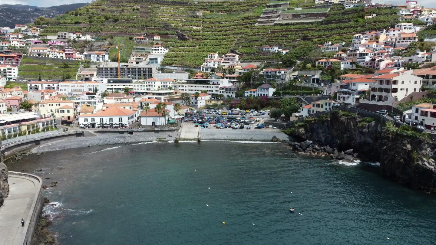 In the bay of the fishermen village Camara de Lobos, west of the city of Funchal. Drone flight backward.
