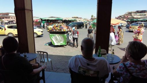 The central square Djemaa el Fna, seen from the Cafe Glacier. UNESCO World Cultural Heritage Site.