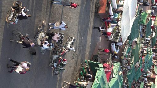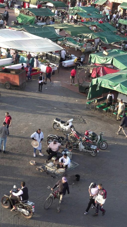 The central square Djemaa el Fna (Jemaa el Fnaa), seen from the Cafe Glacier. UNESCO World Cultural Heritage Site.