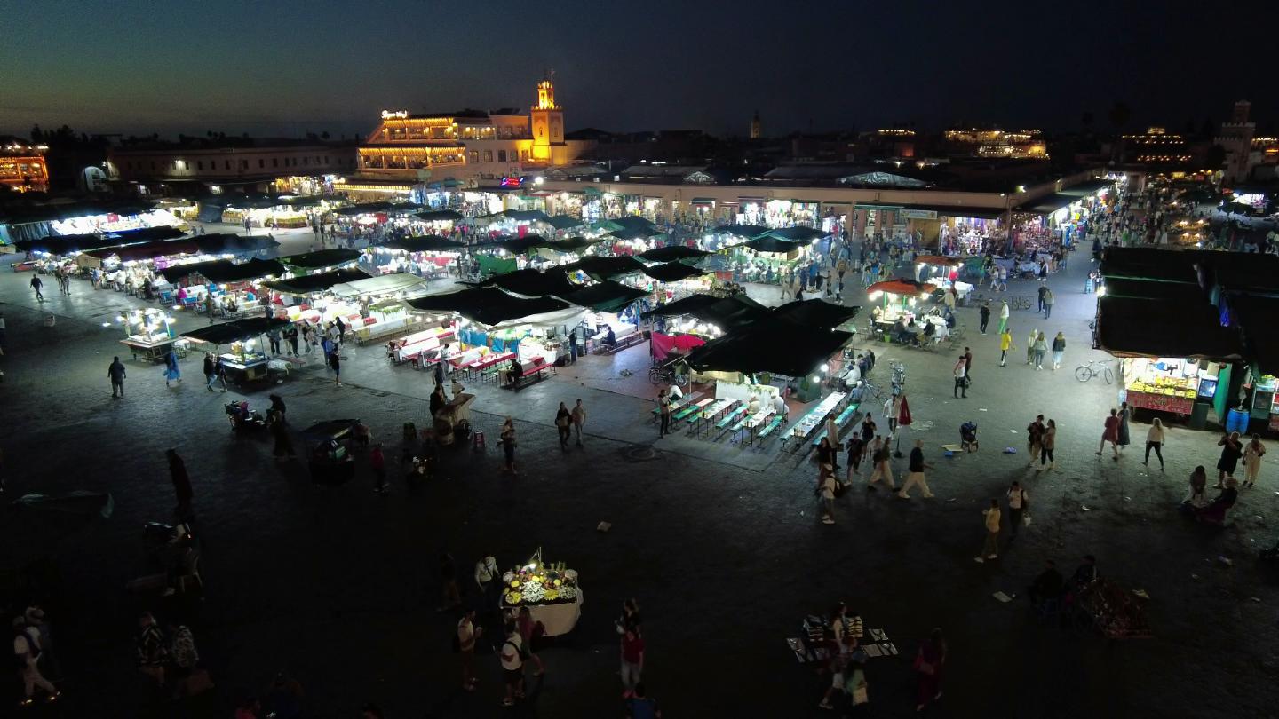 The central square Djemaa el Fna / Jemaa el Fnaa, seen from the Cafe Glacier. UNESCO World Cultural Heritage Site.