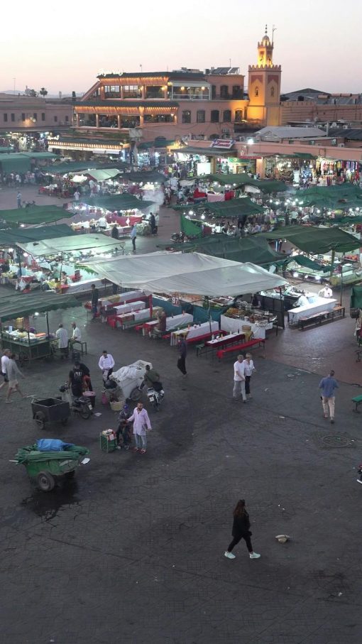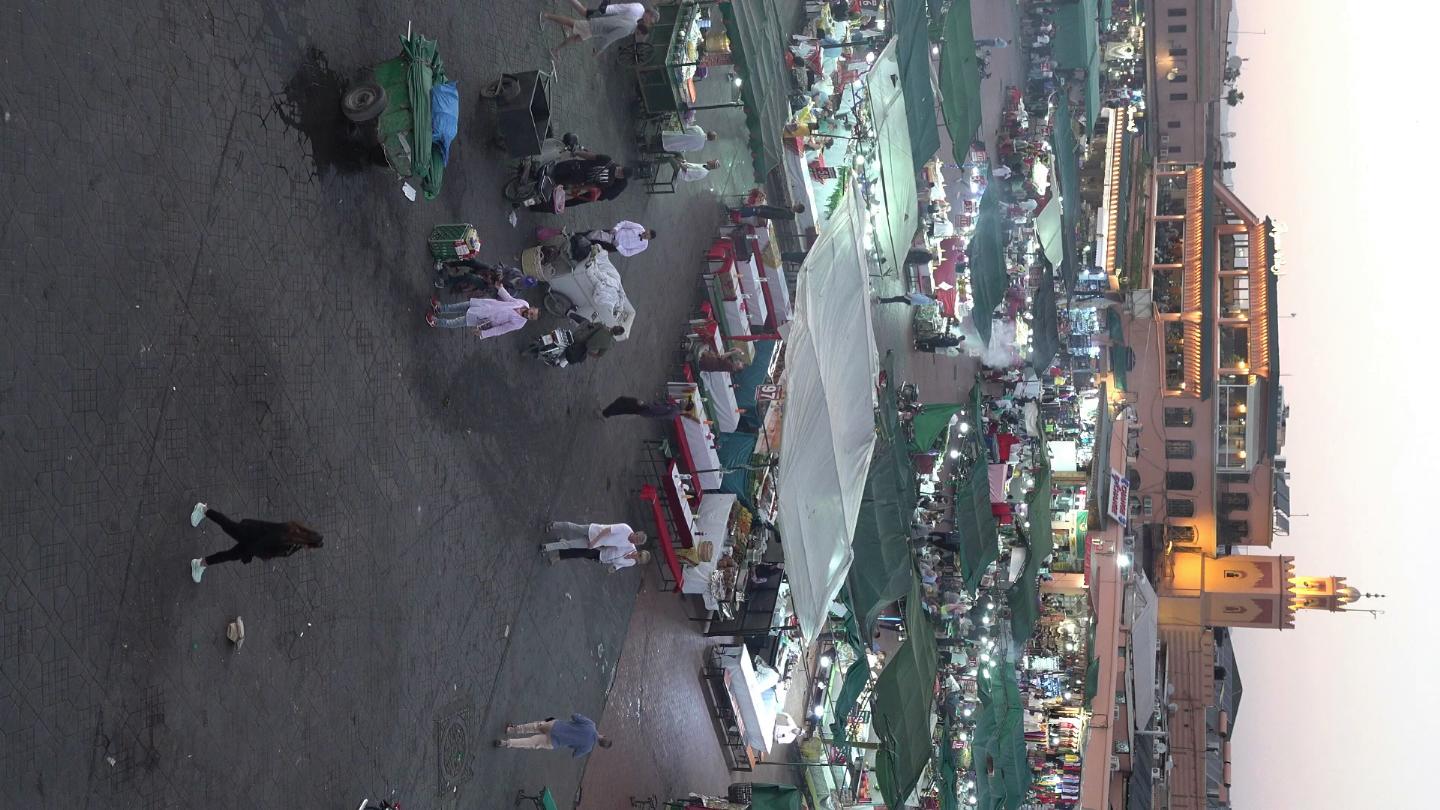 The central square Djemaa el Fna (Jemaa el Fnaa), seen from the Cafe Glacier. UNESCO World Cultural Heritage Site.