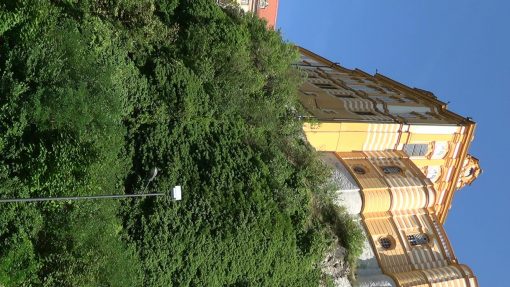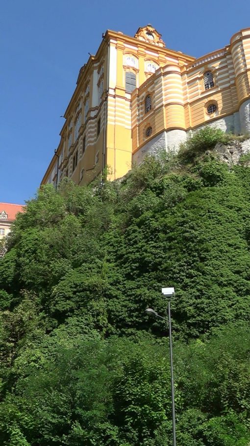 The Benedictine Abbey on the rock, seen from the street. Panorama from the right to the left. This take is closer to the scene than the video clip no. 45836 and the 46700. The abbey is UNESCO World Cultural Heritage Site.