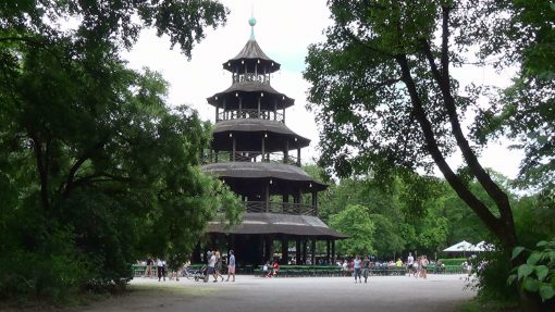 Chinesischer Turm (Chinese Tower) at Englischer Garten. Panorama from the left to the right. This perspectve is closer to the scene than the video clip no. 55123.