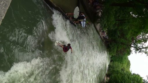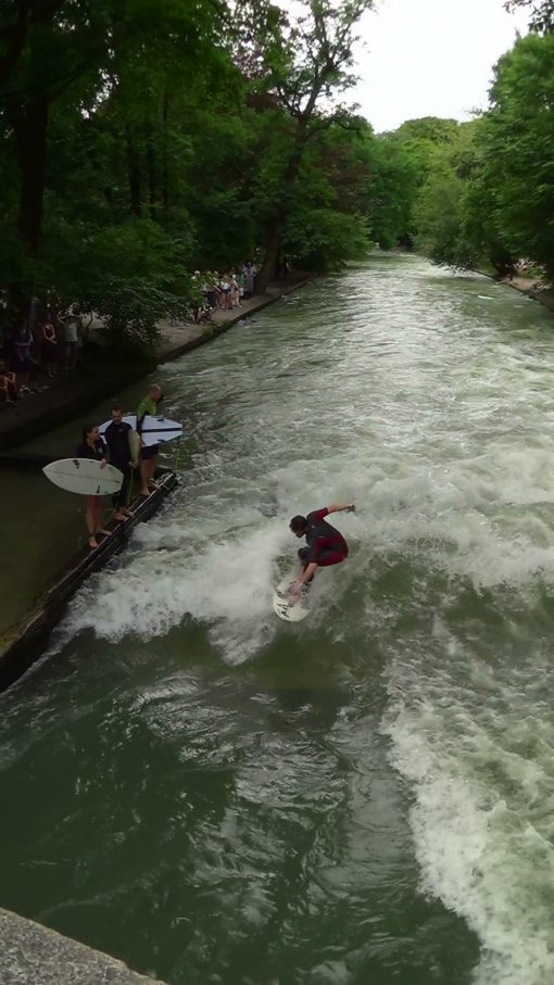 Surfers on the Eisbach (Ice brook) at Englischer Garten. This is a panorama from the right to the left.