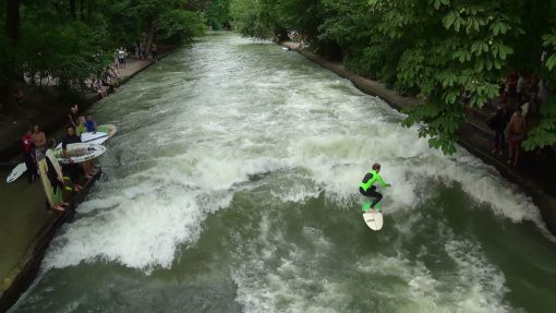 Surfers on the Eisbach (Ice brook) at Englischer Garten, seen from the bridge. This is a tilt up.