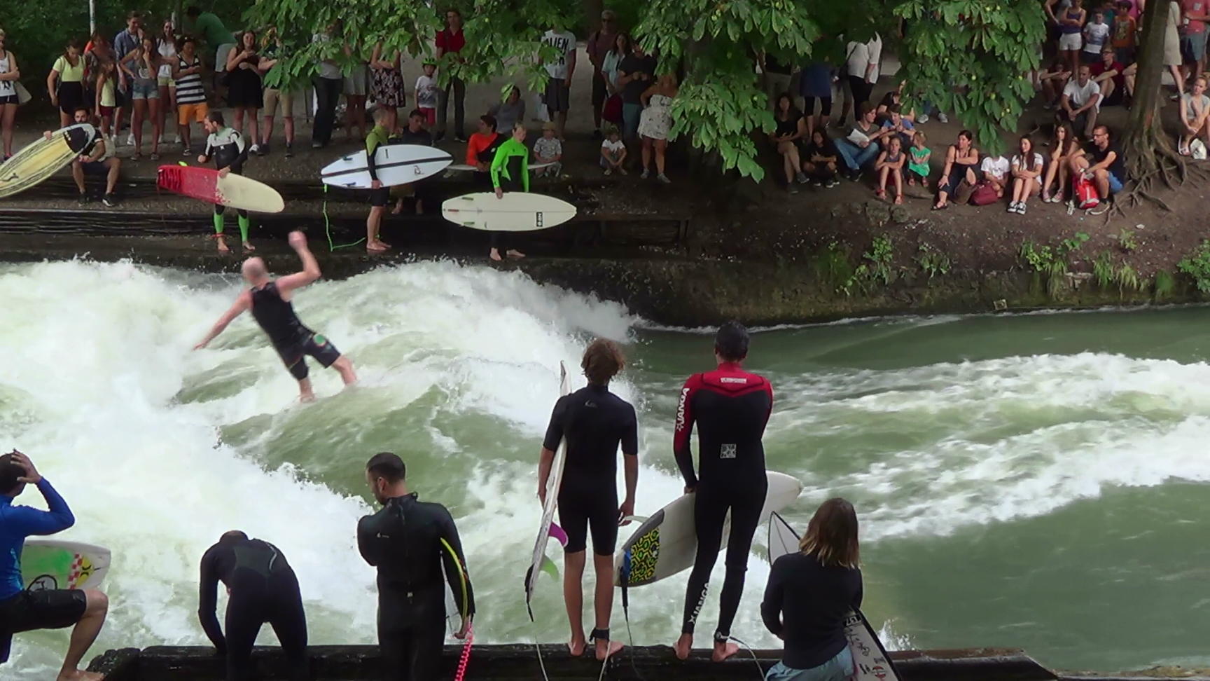 Surfers on the Eisbach (Ice brook) at Englischer Garten.