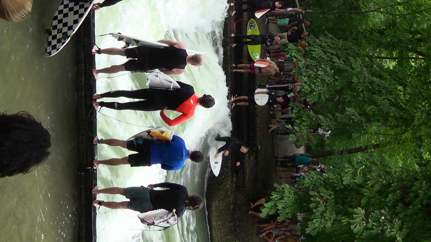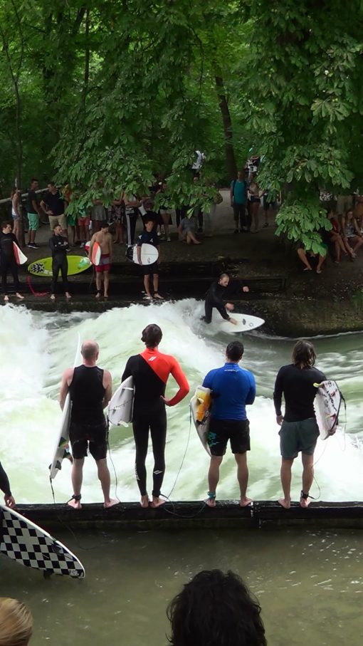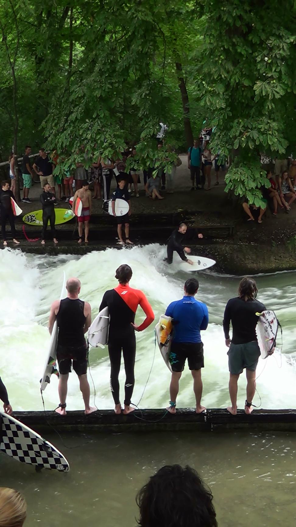 Munich, Germany. Surfers on the Eisbach (Ice brook) at Englischer Garten.