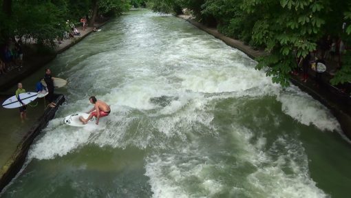 Surfers on the Eisbach (Ice brook) at Englischer Garten, seen from the bridge.