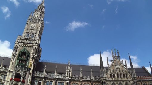Summer sunday on Marienplatz. Bell Play in the tower of the city hall.