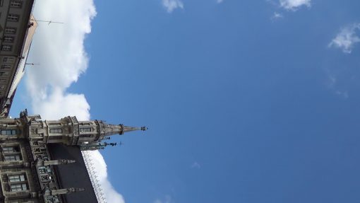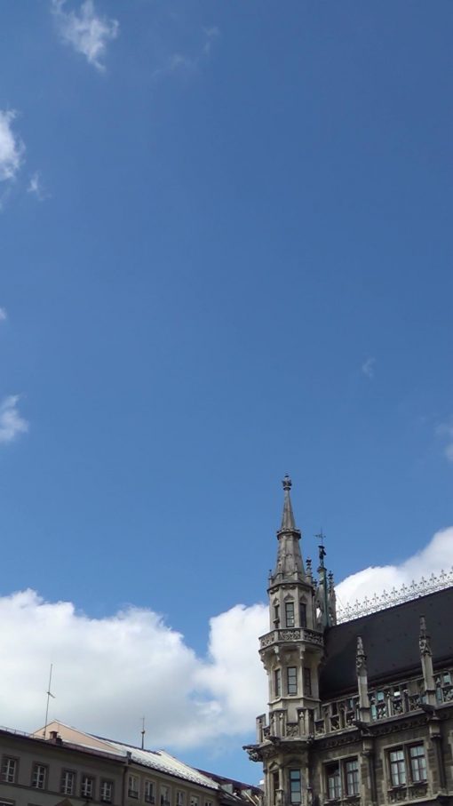 On Marienplatz in the Old Town, the skyline between Frauenkirche (Cathedral of Our Dear Lady) and Rathaus (City Hall). This is a panorama from the left to the right.