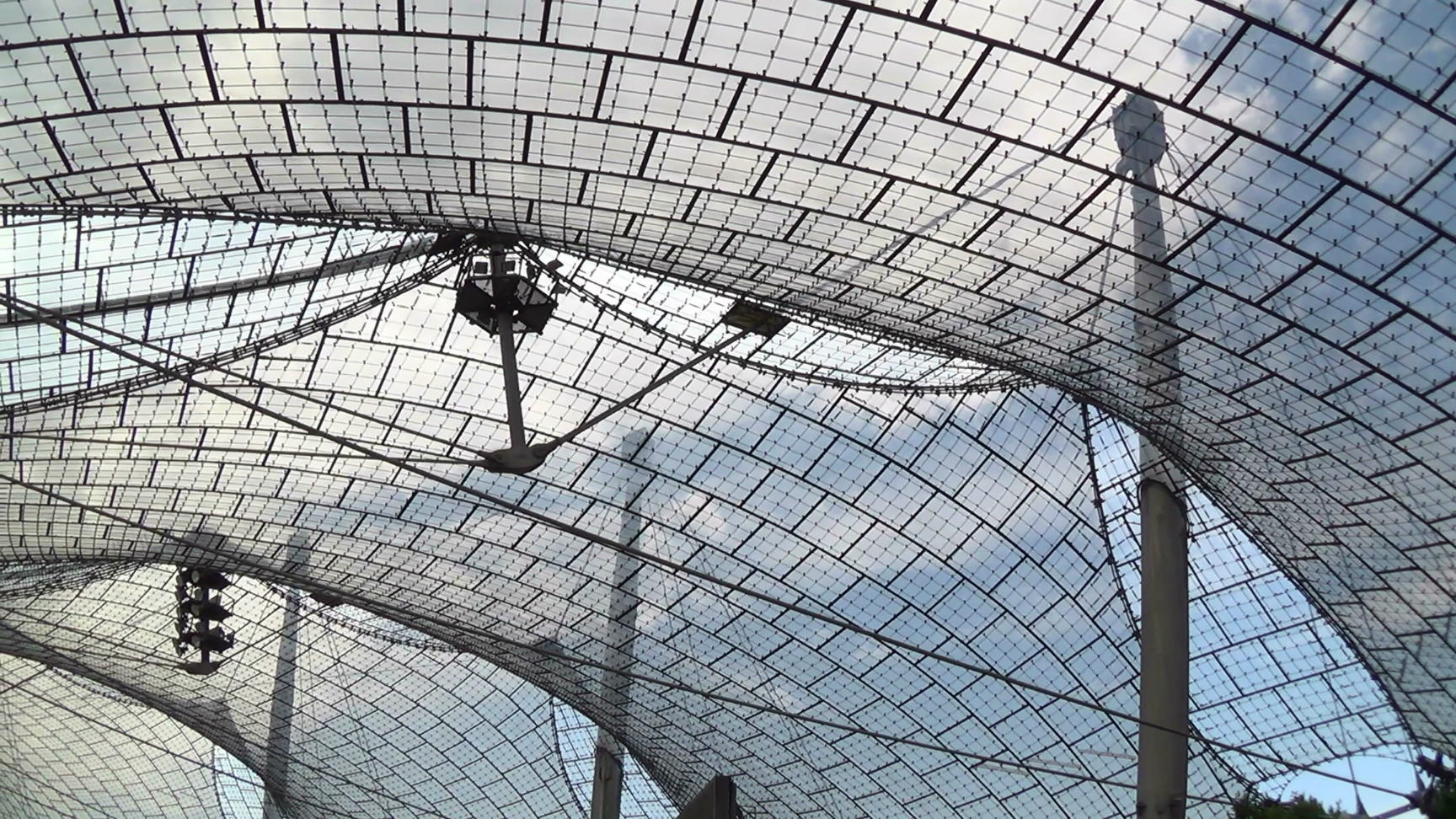 A view up to the roof construction of the Olympic Stadium (built for the 1972 Summer Olympics). This is a panorama from the right to the left.