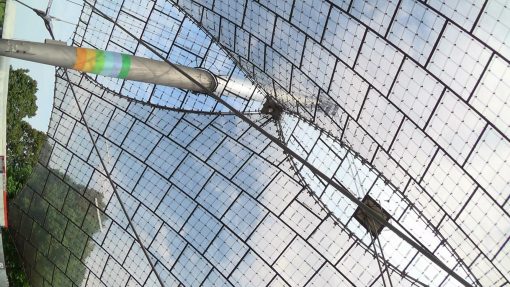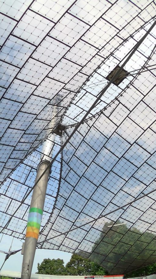 A view up to the roof construction of the Olympic Stadium (built for the 1972 Summer Olympics). This is a panorama from the right to the left.