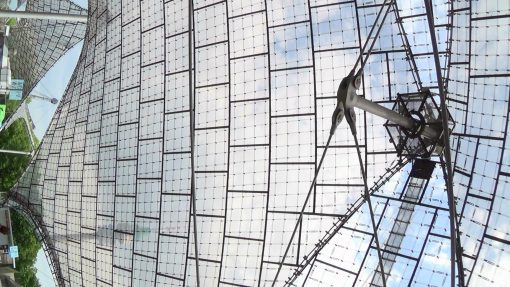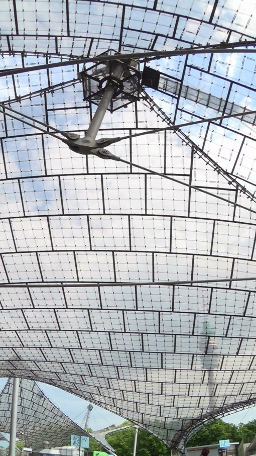 A view up to the roof structure of the Olympic Stadium (built for the 1972 Summer Olympics). This is a panorama from the left to the right.