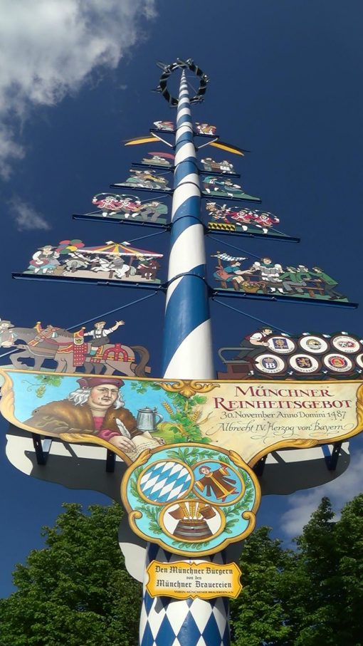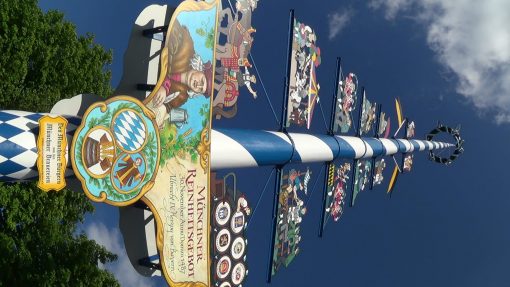 On Viktualienmarkt, a popular gourmet market in the Old Town, a look up the central maypole. The cloud speed is accelerated.
