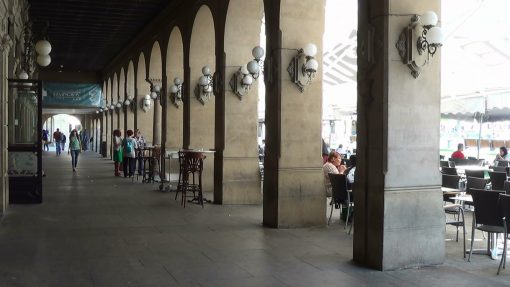 Plaza del Castillo, Cafe Iruna. Pamplona is a city on the Camino de Santiago, famous for the annual Encierro (Run of the Bulls).