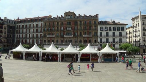 Plaza del Castillo, the locals start into their market day. This is a view towards the Cafe Iruna front. Pamplona is a city on the Camino de Santiago, famous for the annual Encierro (Bulls Run). The Camino de Santiago is UNESCO World Cultural Heritage.