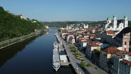 Passau, Alemania. La ciudad vista desde el río Danubio. Este es un vuelo hacia adelante. Día soleado de verano.