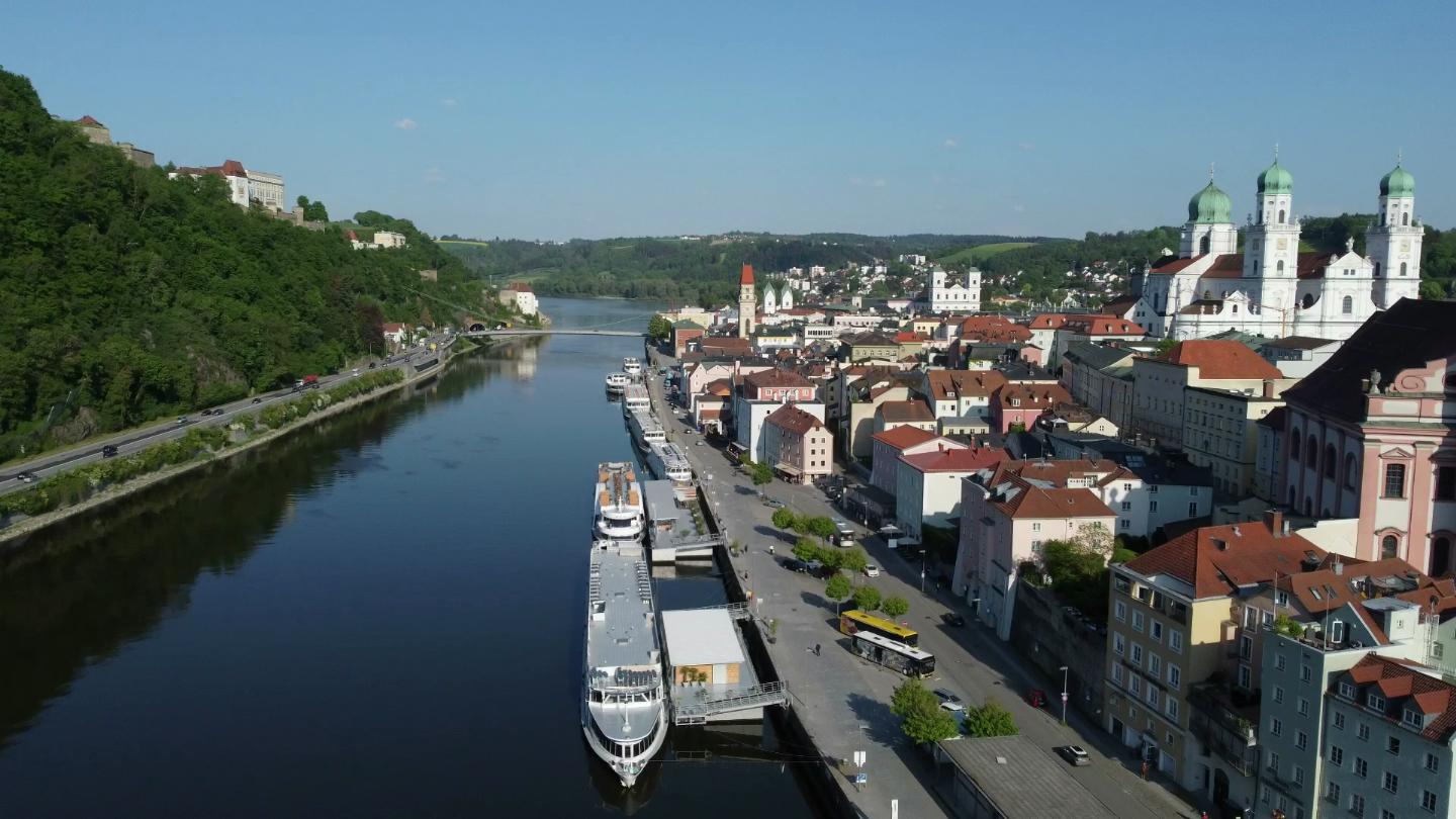 德国帕绍。从多瑙河上看到的城市。这是向前飞行。阳光明媚的夏日。