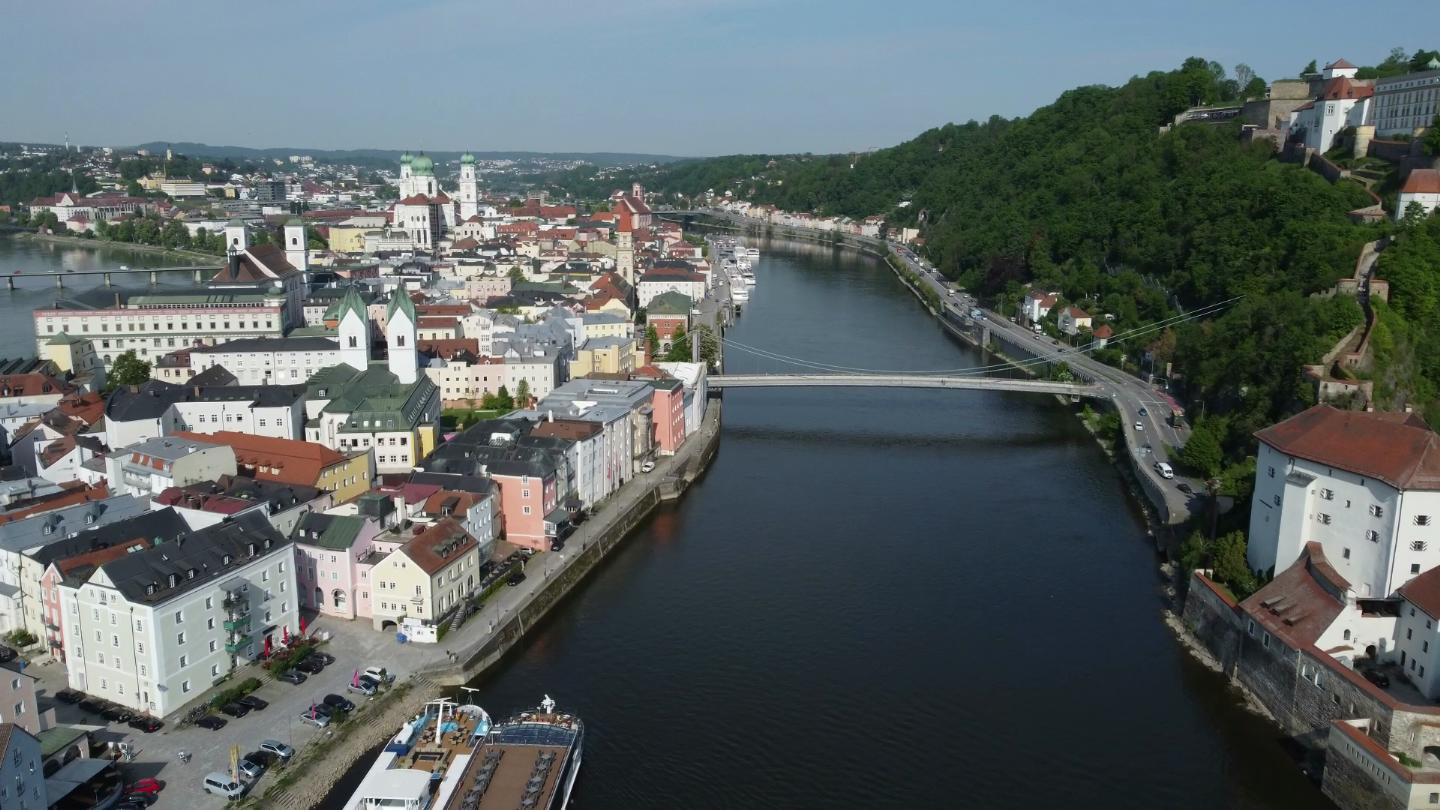 The different colours of the two rivers Danube and Inn are clearly visible. The Inn river on the left hand side is more green (glacier water), the Danube river comes from fertilized land and is darker. This is a flight forward.