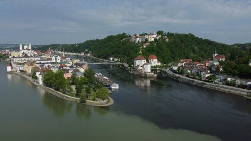 The different colours of the two rivers Danube and Inn are clearly visible. The Inn river on the left hand side is more green (glacier water), the Danube river on the right hand side comes from fertilized land. This is a flight backward.