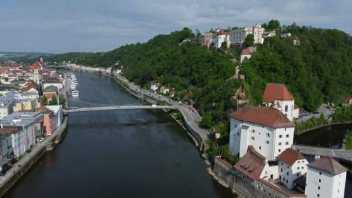 The different colours of the two rivers Danube and Inn are clearly visible. The Inn river on the left hand side is more green (glacier water), the Danube river on the right hand side comes from fertilized land. This is a flight forward.