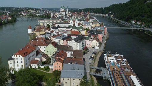 The different colours of the two rivers Danube and Inn are clearly visible. The Inn river on the left hand side is more green (glacier water), the Danube river on the right hand side comes from fertilized land. This is a flight forward.