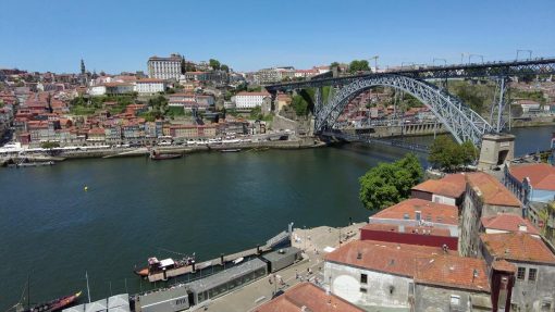 The old town of Porto and the Ponte Dom Luis I, seen from Vila Nova de Gaia. UNESCO World Cultural Heritage Site. The city passes from the left to the right.