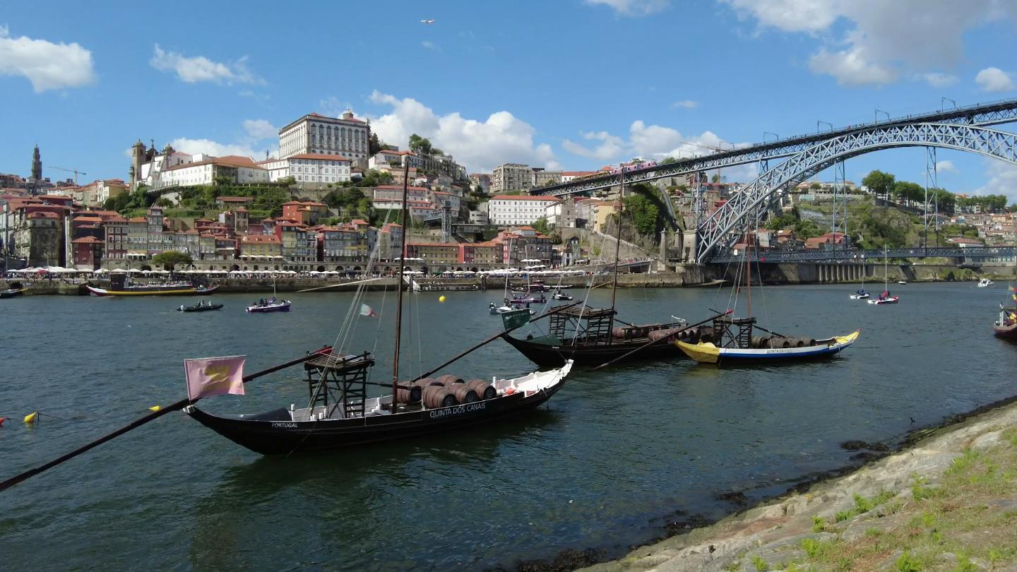 葡萄牙波尔图。从加亚新城看波尔图老城区。前景中的“Rabelos”是波特酒船。阳光明媚的夏日。联合国教科文组织世界文化遗产。