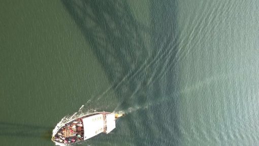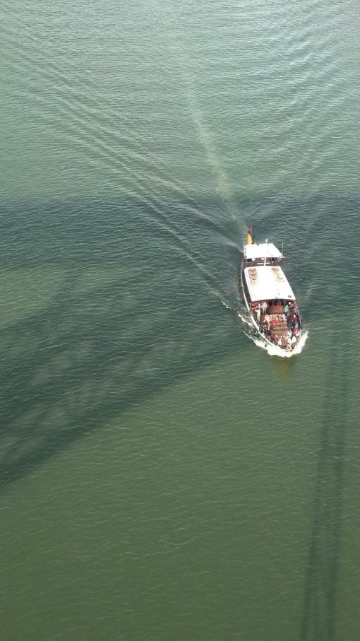A boat on the Douro River crosses the shadow of the Ponte Dom Luis I. The bridge itself is UNESCO World Cultural Heritage Site.