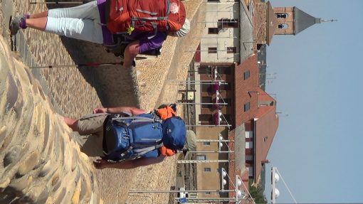 Pilgrims on the bridge Puente de Orbigo in the village Hospital de Orbigo. The Camino de Santiago (St. James Pilgrims Trail) is UNESCO World Cultural Heritage Site.