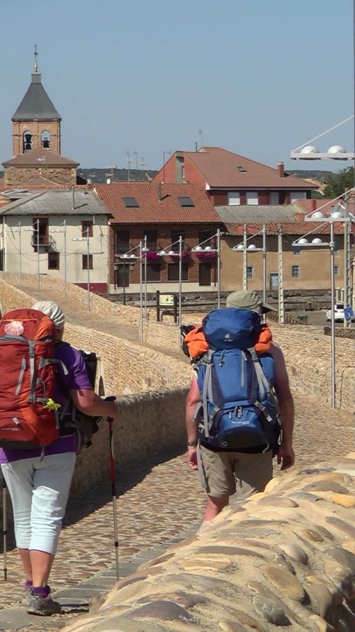 Pilgrims on the bridge Puente de Orbigo in the village Hospital de Orbigo.